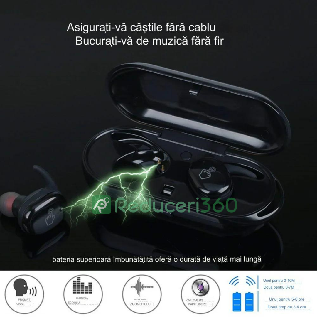 Versiune Bluetooth: V5.0 Compatibilitate: Android / IOS Distanța de utilizare: 15m Timp standby: Aproximativ 300 de ore Timp convorbire: Aproximativ 3 ore Protocol compatibil: HFP / A2DP / HSP / AVRCP Baterie căști: Baterie litiu-polimer de 50mAh Baterie carcasa: Baterie litiu-polimer de 350mAh Tensiune input: DC5V Culoare: Negru Compatibil cu Android, iOS, Windows - Stație de încărcare După ce cască este plasată în dispozitivul de încărcare, bateria va fi încărcată complet în decurs de 1 oră