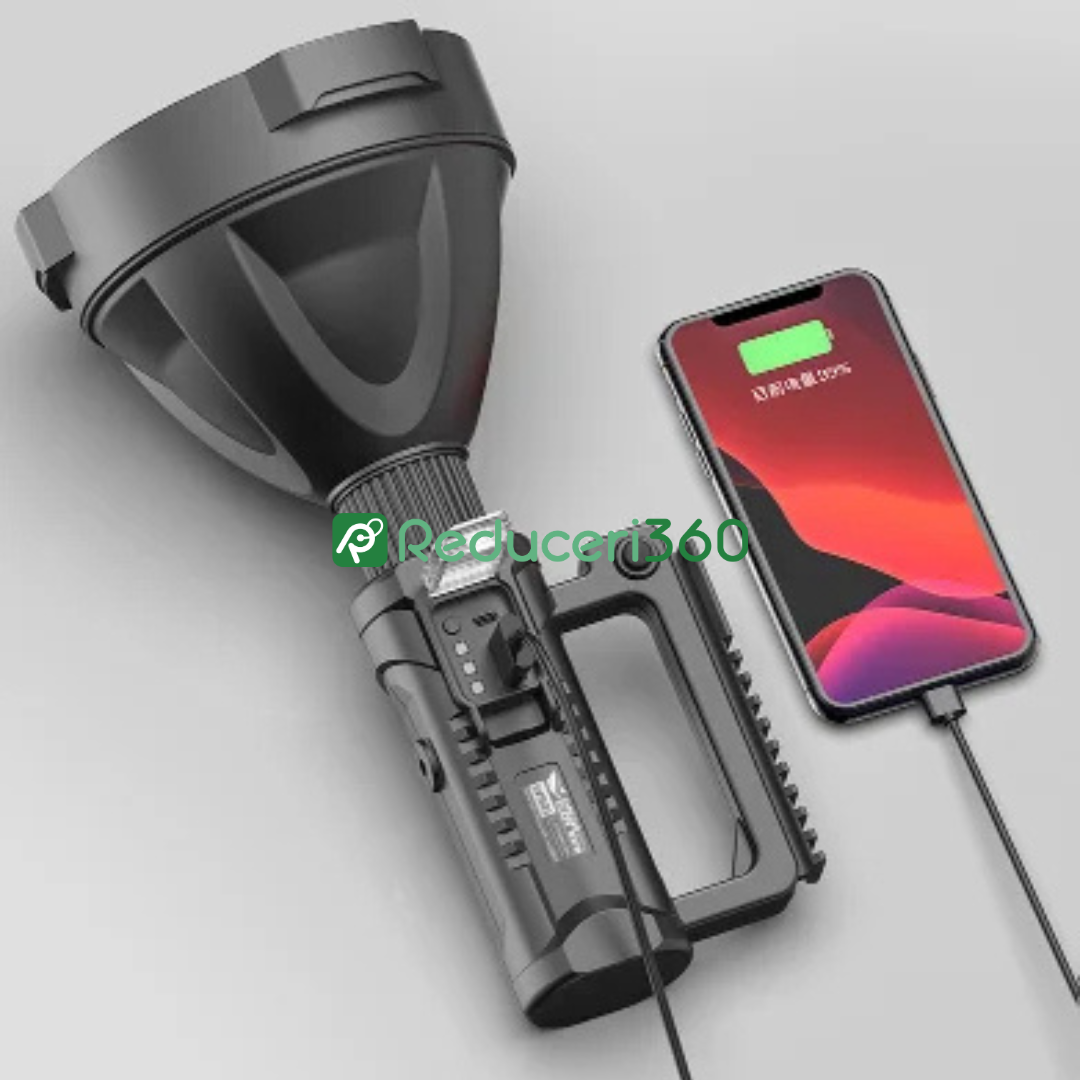 - Lanterna poate fi folosita si ca baterie externa datorita capacitatii mari a bateriei, iar prin intermediul unui cablu usb poate incarca telefonul, tableta sau orice dispozitiv ce are nevoie de curent.