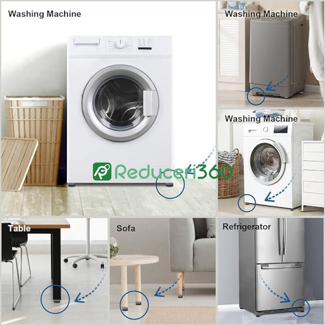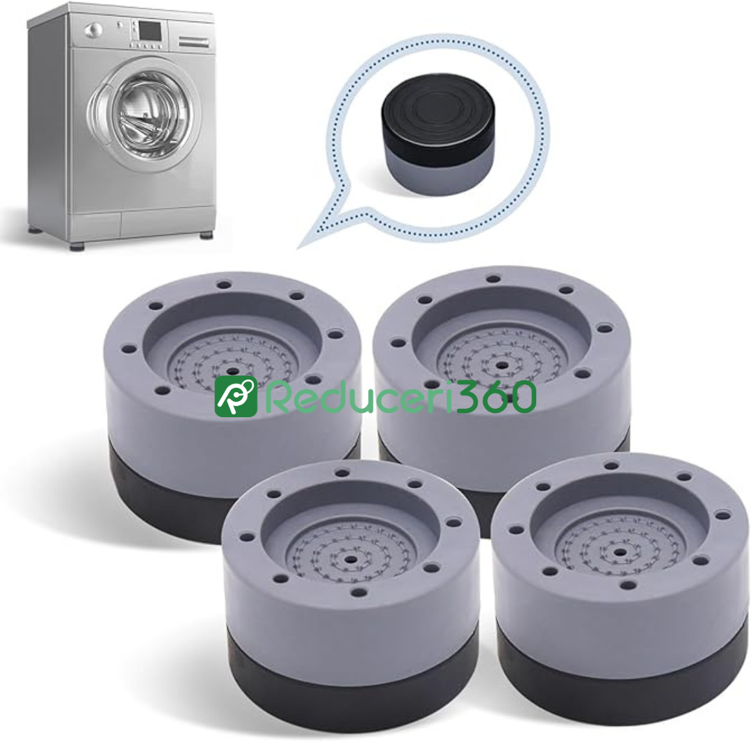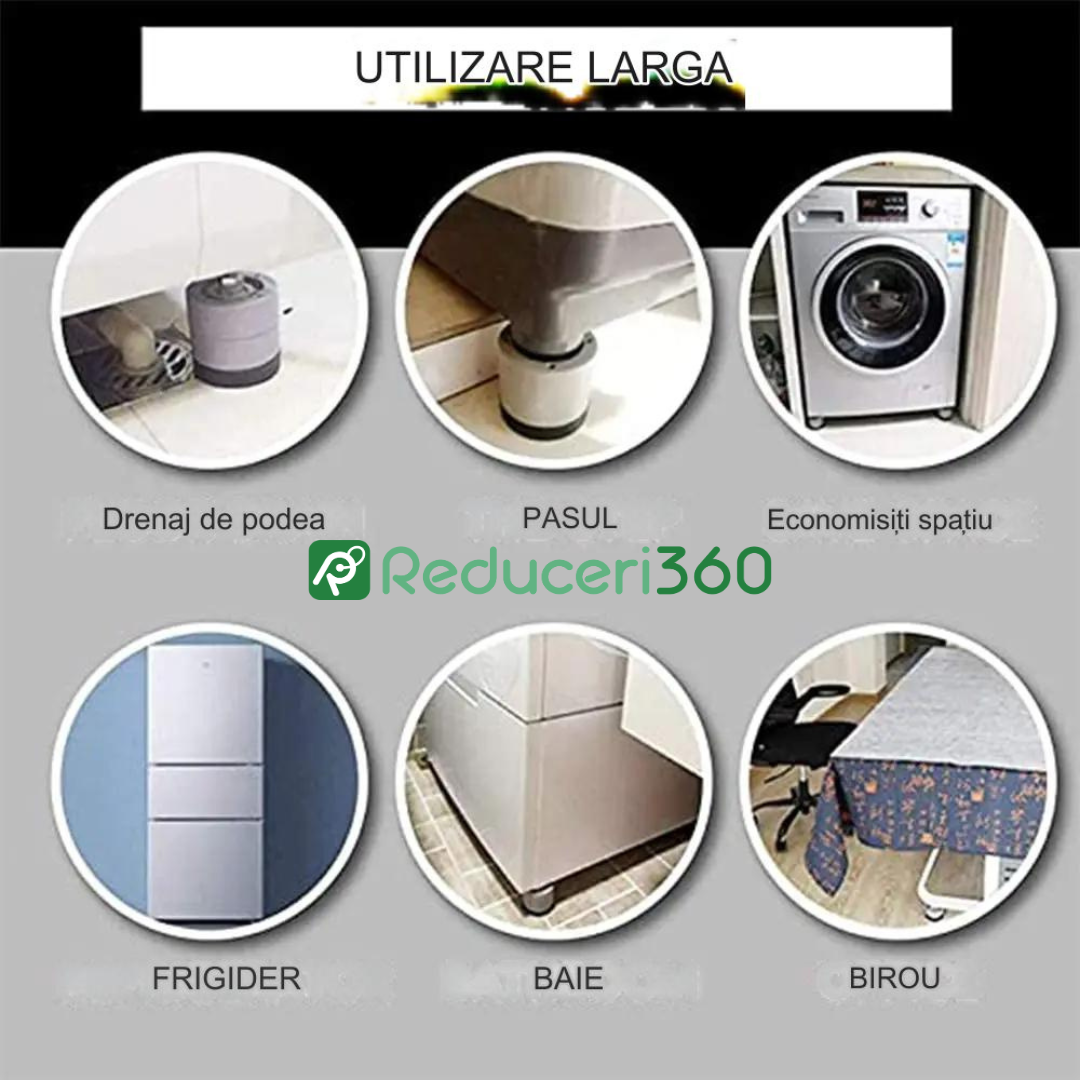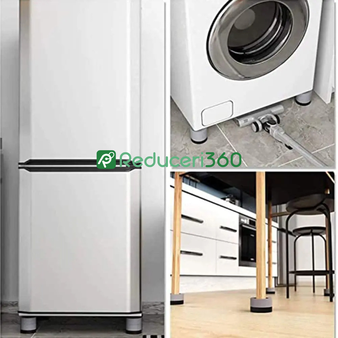 Ti se intampla des ca masina de spalat, sau uscatorul sa trepideze, chiar si la rotatiile mici de spalare sau uscare? Pe langa zgomotul deranjant pe care il provoaca, electrocasnicele se pot strica, sau se poate produce o coliziune in timp ce se deplaseaza. Cu setul de 4 suporti, aceste lucruri pot fi evitate. Mai mult, suportii pot fi utilizati si pentru momentele in care vreti sa curatati pe sub unele obiecte de mobilier, sau sa le ridicati, pentru a preveni formarea florilor de mucegai.