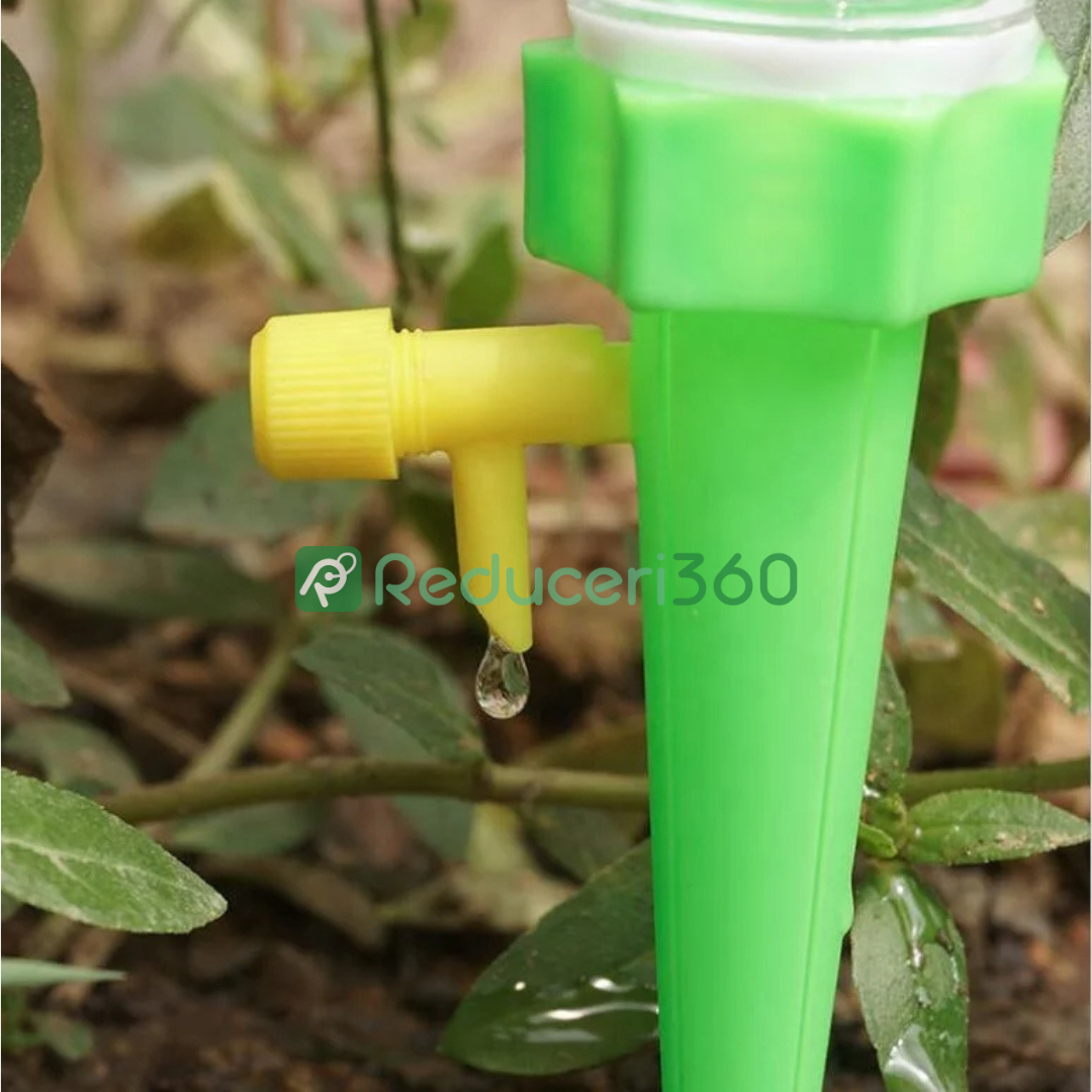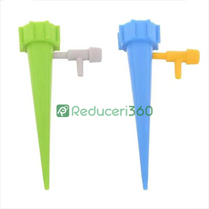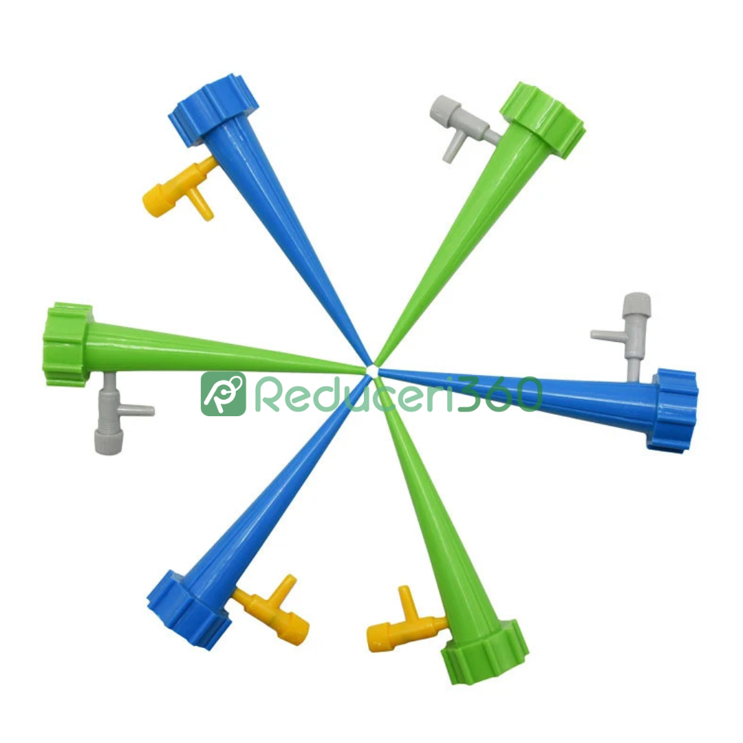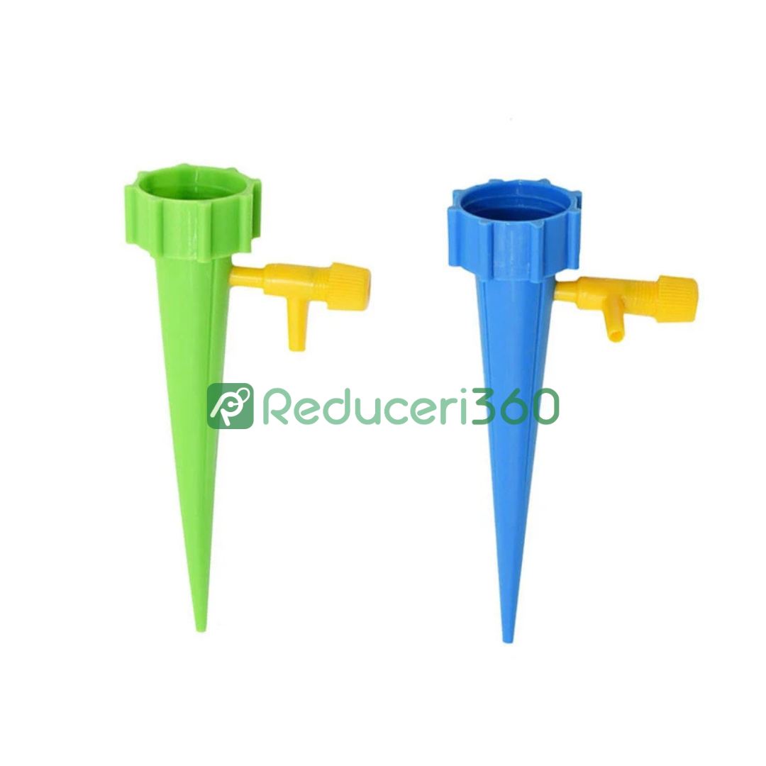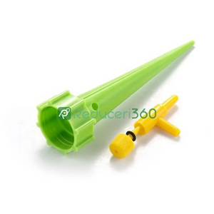 Design foarte simplu pentru udat în combinație cu o sticlă obișnuită. Țepusa se înfiletează pe sticlă în locul dopului. Supapa reglabilă vă permite să setați debitul de apă pentru o udare optimă în funcție de nevoile plantelor. Fără sisteme complexe și costisitoare. Setul conține 12 țepușe pentru udat, astfel încât veți putea avea grijă de toate plantele.