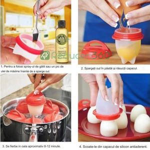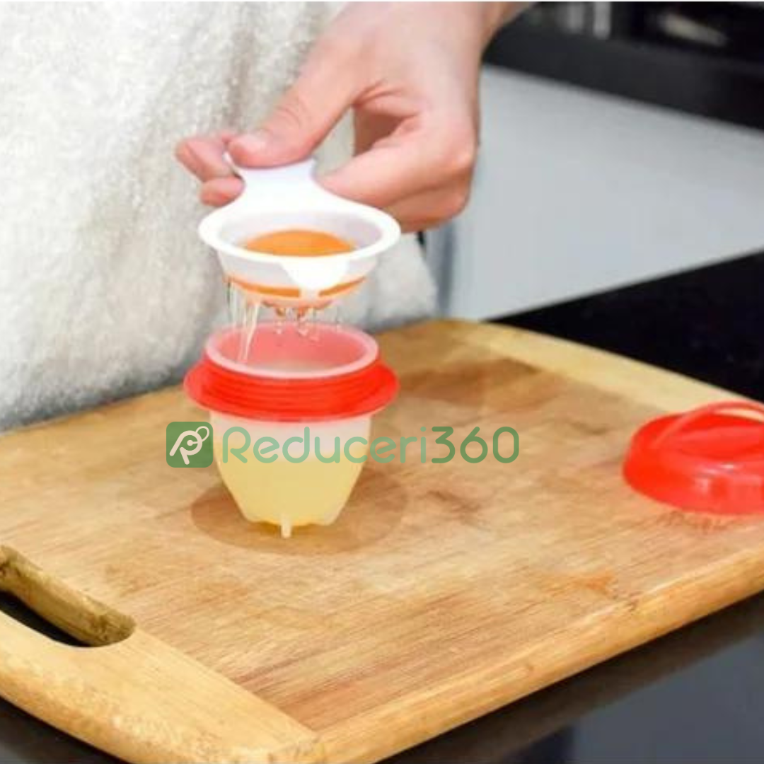 Daca esti un fan al oualor posate sau fierte, in mod cert pana acum ai avut dificultati privind timpul de fierbere al apei pentru a obtine oua moi, sau ai intampinat neplaceri cand a trebuit sa indepartezi coaja. Sa nu mai vorbim despre metodele complicate de a obtine direct oua posate. Cum sa le folosesti? Tot ce trebuie sa faci este sa ungi interiorul fiecarei forme cu putin ulei pentru gatit, spargi oul, lasi albusul si galbenusul sa se scurga in forma din silicon, fixezi capacul si scufunzi fiecare suport in apa pusa la fiert.