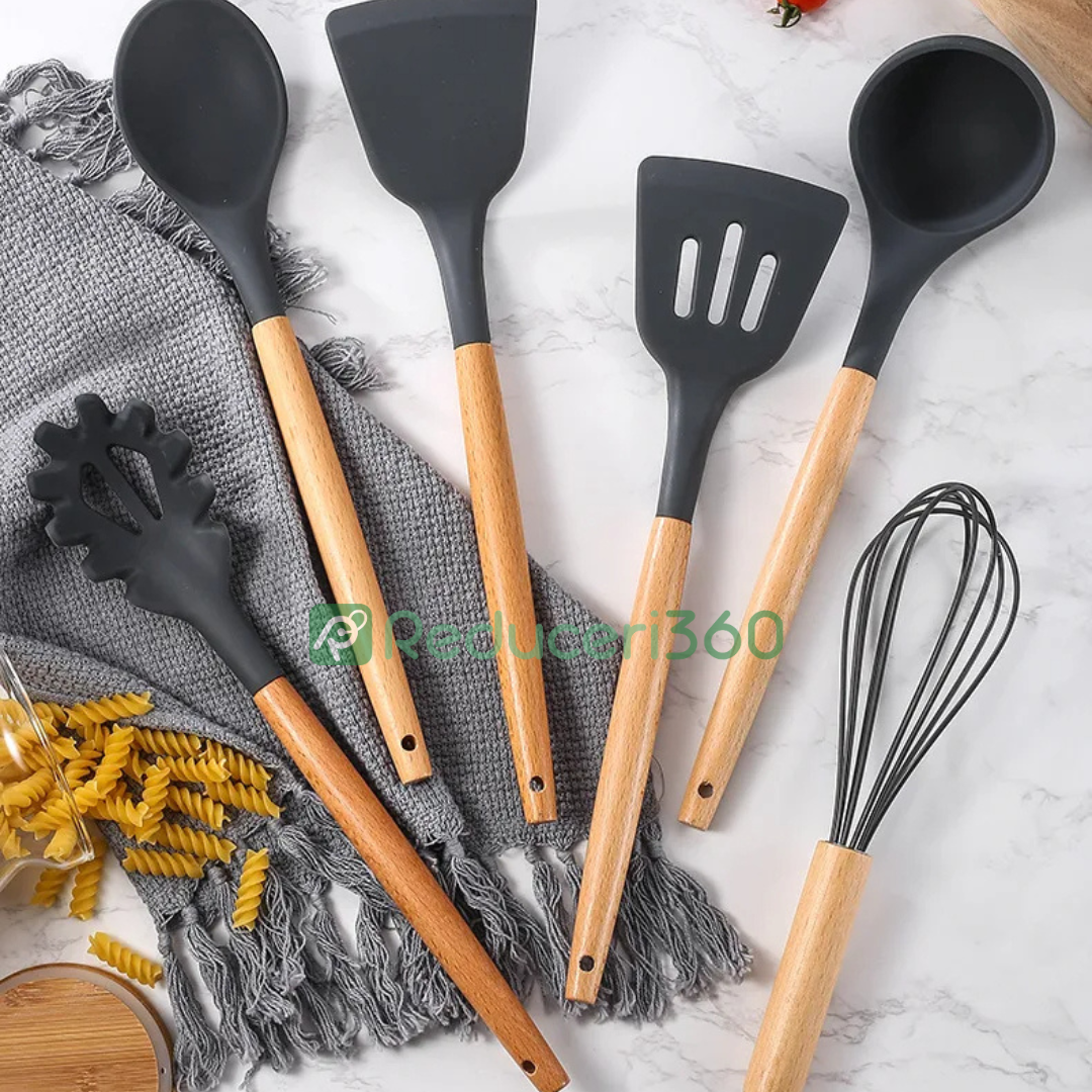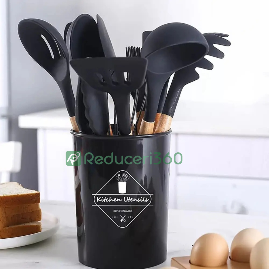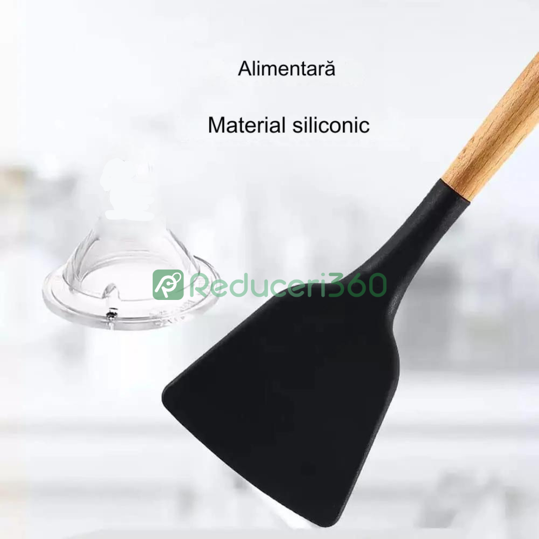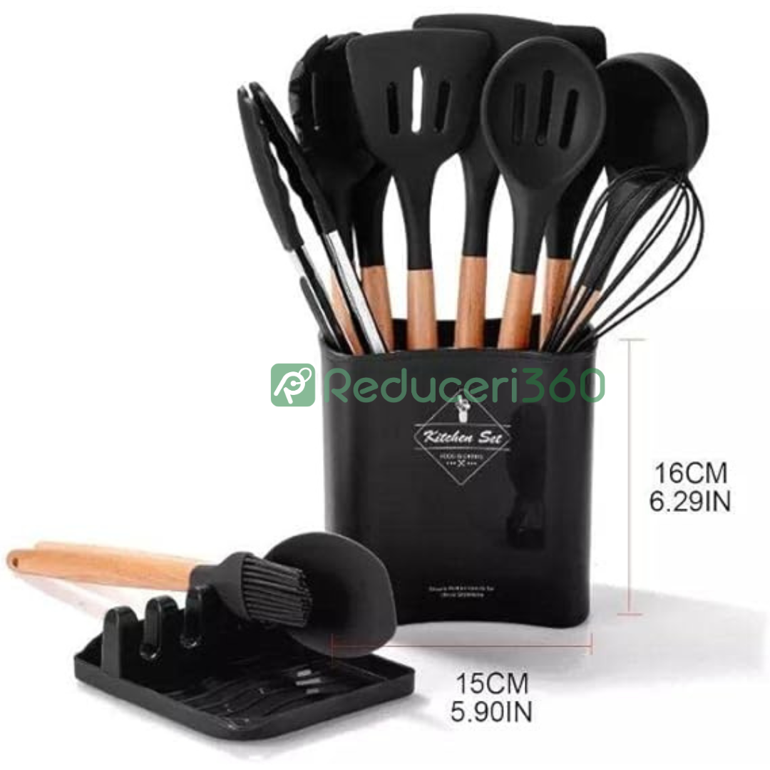 Set ustensile bucatarie 12 piese Lemn si Silicon alimentar Termorezistente Antiaderente Suport Blat negru