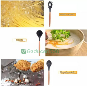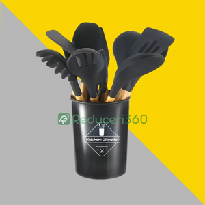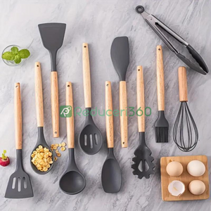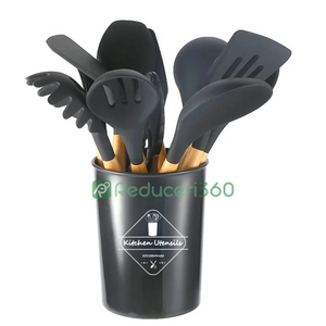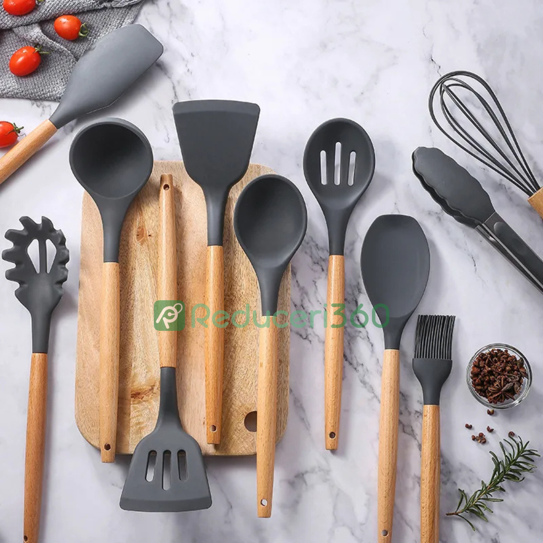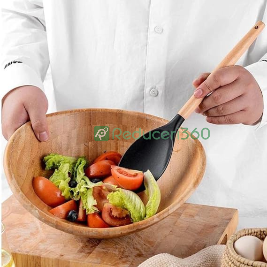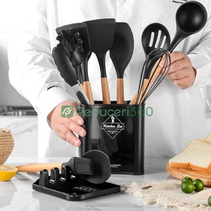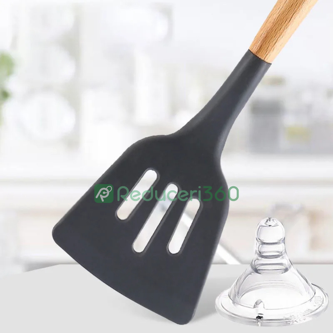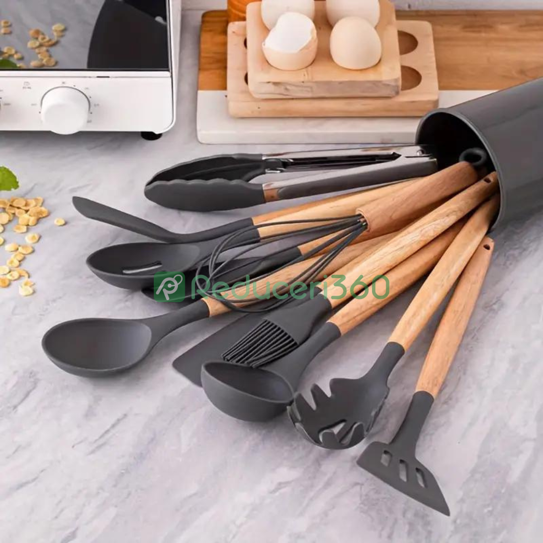 Set ustensile bucatarie 12 piese Lemn si Silicon alimentar Termorezistente Antiaderente Suport Blat negru