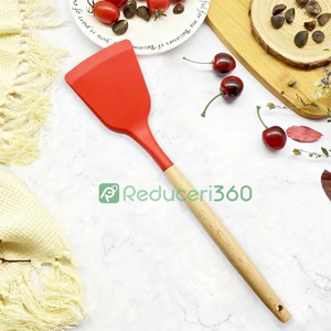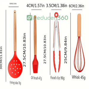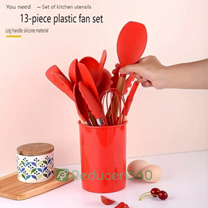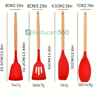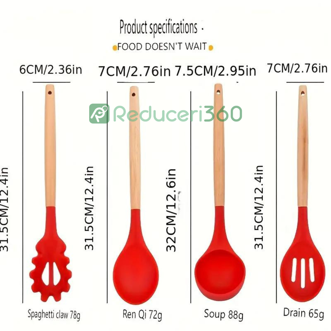 Set ustensile bucatarie 12 piese Lemn si Silicon alimentar Termorezistente Antiaderente Suport Blat Rosu