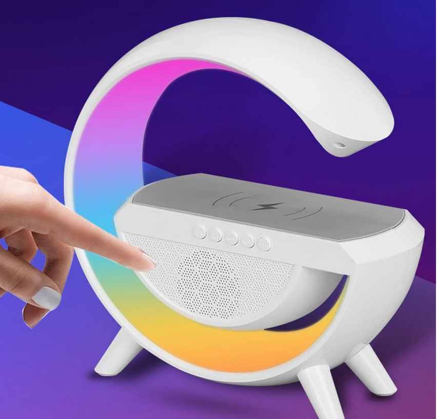Statie Incarcare Wireless SIKS 3 in 1 cu lampa RGB, Boxa Bluetooth, Difuzor 5W, Ceas Digital Cu Alarma , Lumini Ambientale, Sincronizare muzicala , USB, FM Radio, MicroSD ,Control Aplicatie, Alb