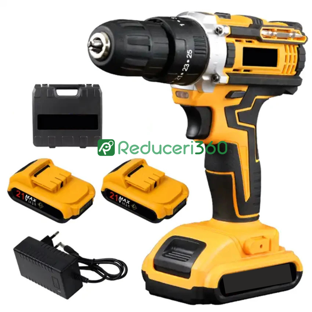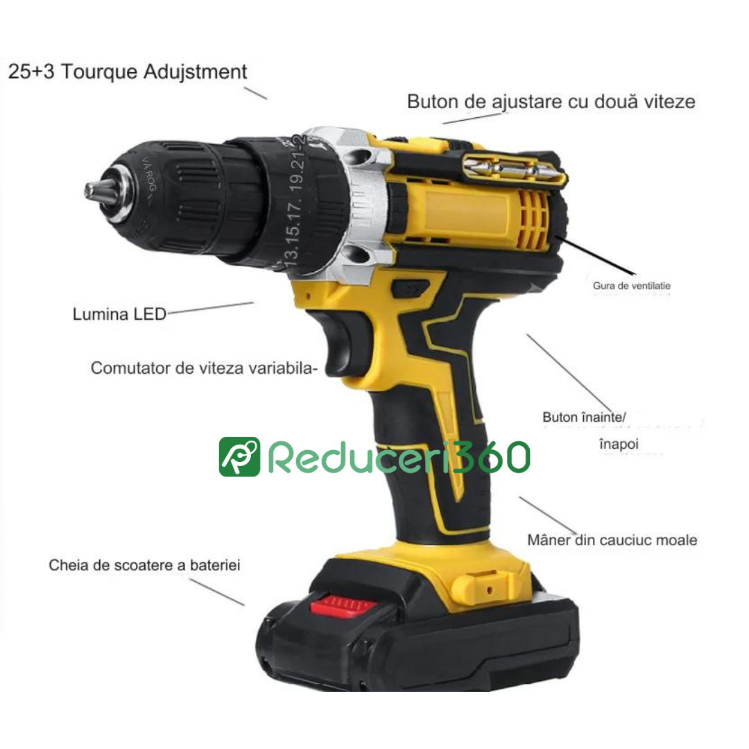 3 Moduri selectabile de strangere: Un mod cu PERCUTIE. Un mod pentru gaurit cu spiral. Un mod pentru infiletat surub ambreaj automat. Trepte de turatie: 18 Controlul electronic al turatiei permite selectarea vitezei optime de lucru. Mandrina rapida (fara cheie) permite schimbarea usoara a accesoriilor. Angrenaj metalic pentru o durabilitate ridicata. Mandrina de 10 mm cu sistem de blocare automat pentru schimbarea rapida a varfului de insurubat cu o singura mana. Viteza variabila, 2 setari de viteza si comutator de schimbare a directie de insurubare pentru control maxim. Designul inteligent al comutatorului permite control total in aplicatii Cele 18 pozitii reglabile pentru controlul cuplului asigura insurubare constanta in diverse materiale cu suruburi de dimensiuni diferite Led alb-stralucitor cu temporizare pentru vizibilitate sporita si functionalitatea unei lanterne Designul ergonomic imbunatatit si manerul acoperit cu cauciuc sporeste confortul utilizatorului.