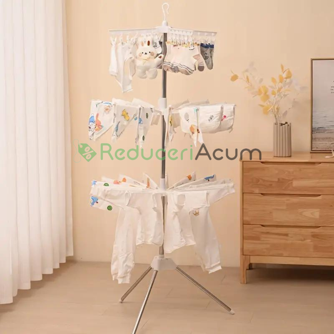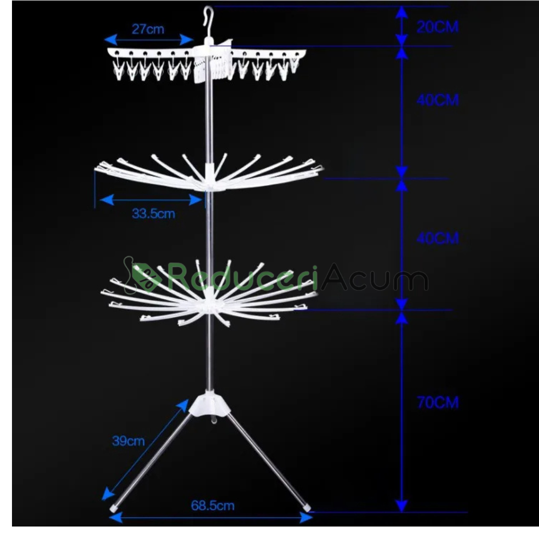 Acest suport de uscare este foarte popular in randul clientilor nostri, deoarece este compact, dar foarte durabil si are suficient spatiu pentru a va usca cu usurinta hainele.Puteti folosi suportul de uscare pentru a usca tot felul de haine. Usor de instalat și practic, uscatorul de rufe vertical At Performance aduce o soluție eficienta pentru uscarea hainelor. Cu 3 nivele ajustabile, acesta ofera un spațiu generos pentru hainele tale. Rotative la 360 de grade, nivelele aduc un plus de flexibilitate în procesul de uscare.Acest suport de uscare pliabil poate fi asezat pe podea, blat sau chiar in cada daca aveti nevoie de spatiu, pentru a va asigura ca hainele se usuca cat mai repede si bine.Fiecare strat poate fi rotit liber, uscarea este mai convenabila.